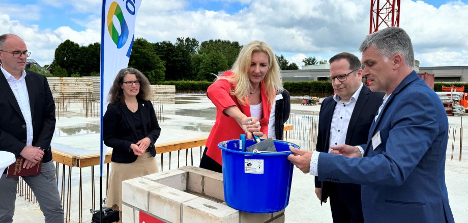 Gestern erfolgte die Grundsteinlegung für die neue Multifunktionshalle. Im Beisein zahlreicher Bürger*innen und Ratsmitglieder füllten Bürgermeisterin Karin Rodeheger und Stadtbaurat André Leson die Zeitkapsel, die in der nächsten Zeit in ein Mauerteil der späteren Halle eingelassen wird. Danach sprachen Pfarrerin Melanie Erben und Pfarrer Pollmann einen kirchlichen Segen und ein gemeinsames Gebet.