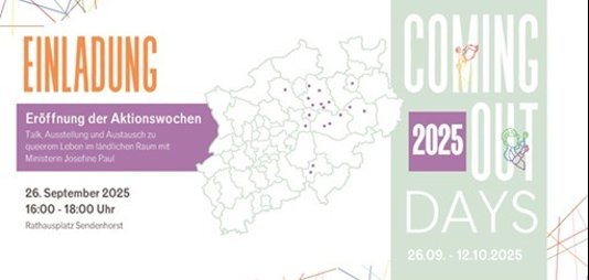 Am 26.09.2025 findet die Eröffnung der Aktionswochen (26.09.-12.10.2025) zum Coming Out Day in Sendenhorst statt, an denen sich acht Regionen beteiligen.