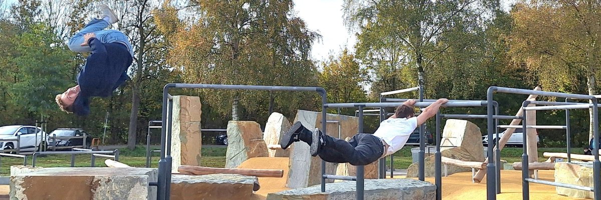 Die neue Parkour-Anlage in Oelde wurde Ende Oktober 2024 eröffnet. Vom Anfänger bis zum Profi: auf der großzügigen Anlage aus Natursteinen, Metall und Holz-Elementen kommen alle Parkour-Begeisterten auf ihre Kosten. Im hinteren Bereich der neue Anlage sind zudem eine Calisthenics-Area und zwei Street-Ball Felder entstanden.