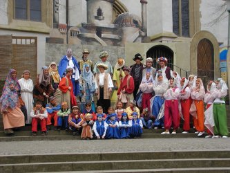 Zu Füßen der Heilig-Kreuz-Kirche, auf den breiten Stufen vor dem Kirchenportal, beginnen im Mai die Aufführungen des Kinderstücks, im Sommer stehen die Darbietungen des Erwachsenenstücks auf dem Programm.