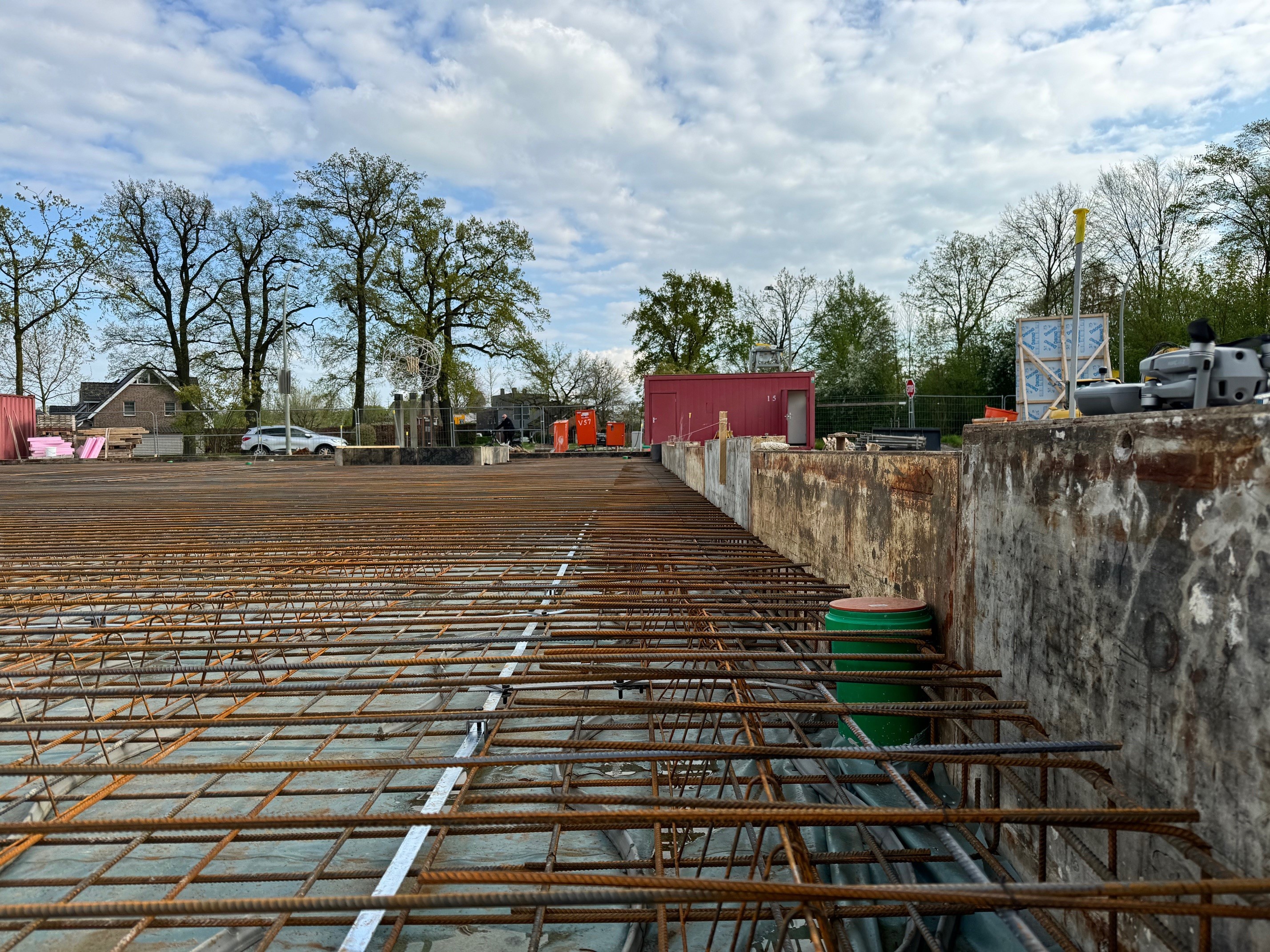 Die 3000 qm große Grundfläche der Multifunktionshalle wurde für die Arbeiten an der Bodenplatte in sechs Segmente aufgeteilt. In der kommenden Woche wird auf dreien dieser sechs Segmente die Bewehrung fertiggestellt sein, sodass die Betonarbeiten hier beginnen können. Am Dienstag, 16. April, werden rund 65 Betonmischer 500 m³ Beton an die Baustelle liefern. An diesem Tag können Lärmbelästigungen nicht ausgeschlossen werden.
