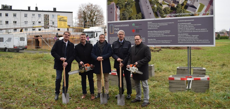 Gemeinsam mit den Verantwortlichen des Bauherrn sowie dem zukünftigen Betreiber erfolgte am Freitag, 06.12.2019, der Spatenstich für den Generationenpark an der Hans-Böckler-Straße. Bis zum 01.08.2020 soll hier eine neue Kindertageseinrichtung für 80 Kinder in vier Gruppen entstehen. Rund ein Jahr später soll der Rest des Generationenparks fertiggestellt werden. Hier sollen 80 Pflegeplätze (70 vollstationäre, 10 eingestreute Kurzzeitpflegeplätze), ca. 12 Wohnungen für betreutes Wohnen sowie 15 Plätze in der Tagespflege entstehen.