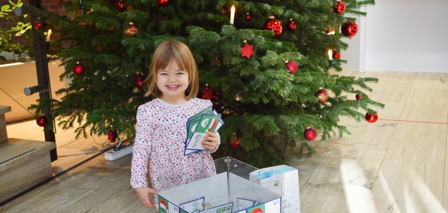 Das Bild zeigt die Glücksfee Tessa Guck vor der Losbox.