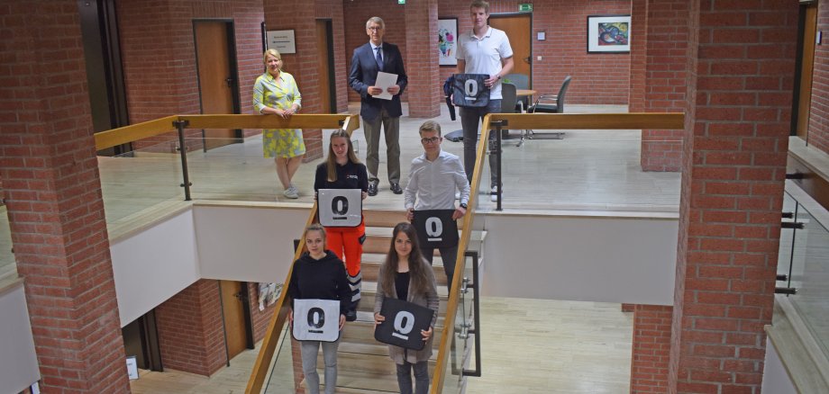 1. Reihe: Ausbildungsleiterin Melanie Westerbeck, Bürgermeister Karl-Friedrich Knop, Leon Hackelbörger;