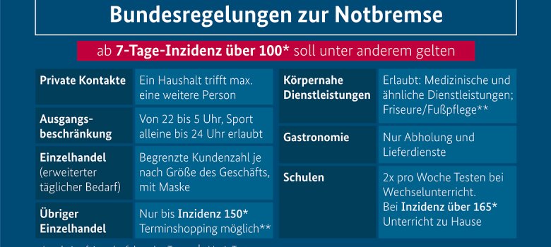 Ab Freitag (23. April) tritt das Vierte Bevölkerungsschutzgesetz deutschlandweit in Kraft. Es sieht für Kreise, in denen die Sieben-Tages-Inzidenz von 100 an drei aufeinanderfolgenden Tagen überschritten wird, einen harten Lockdown mit Kontaktbeschränkungen, Ausgangssperren, der weitgehenden Schließung des Einzelhandels, der Gastronomie, von Dienstleistungsbetrieben sowie Kultur- und Freizeiteinrichtungen vor.