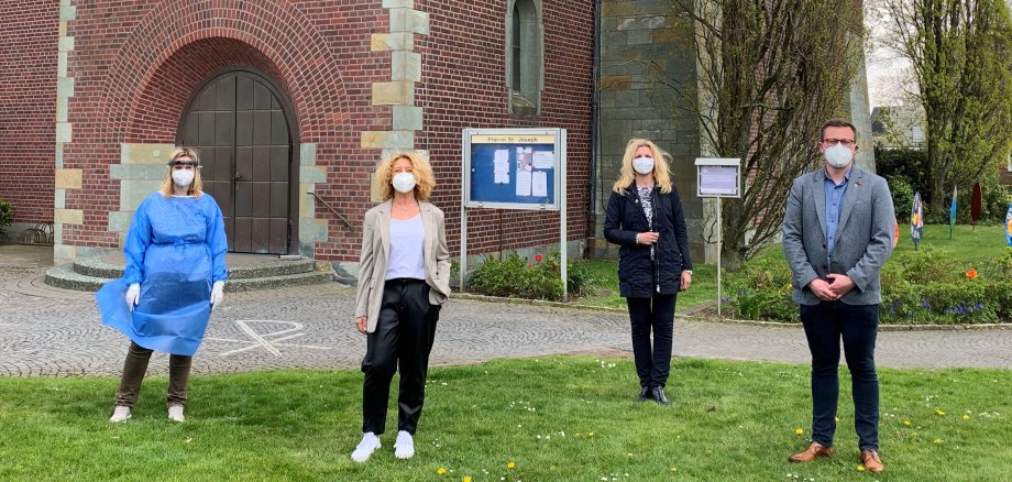 (auf dem Bild: Mitarbeiterin Sabine Lindenau, Betreiberin Brigitta Calascibetta, Bürgermeisterin Karin Rodeheger, Kaplan Niklas Belting)