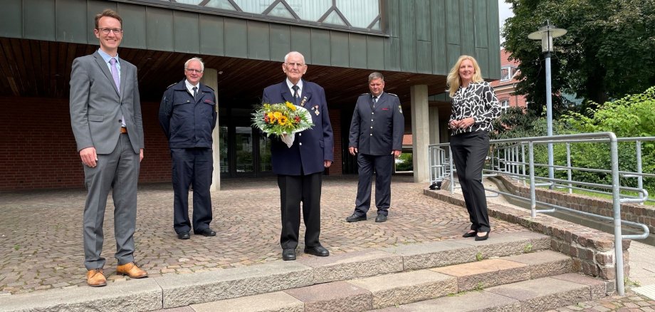 Ein besonderer Tag: Bürgermeisterin Karin Rodeherger, Leiter der Feuerwehr Michael Haske, Kreisbrandmeister Heinz-Jürgen Gottmann und Fachbereichsleiter Jakob Schmid (v.r.n.l.) gratulieren Albert Brüggenkamp (Mitte) zu seinem 80-jährigen Jubiläum bei der freiwilligen Feuerwehr Oelde.