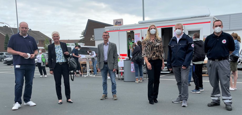 Jede Impfung zählt: Lennart Cornelsen (Leitungsteam des Impfzentrums des Kreises Warendorf), Brigitte Klausmeier (Sozial- und Gesundheitsdezernentin des Kreises), Ralf Holtstiege (Leiter des Amts für öffentliche Sicherheit, Ordnung und Straßenverkehr des Kreises), Oeldes Bürgermeisterin Karin Rodeheger, Hendrik Zummersch und Stephan Böker vom Oelder Ortsverband des Deutschen Roten Kreuz (v.l.) begleiten den Start der mobilen Impfaktion in Oelde.