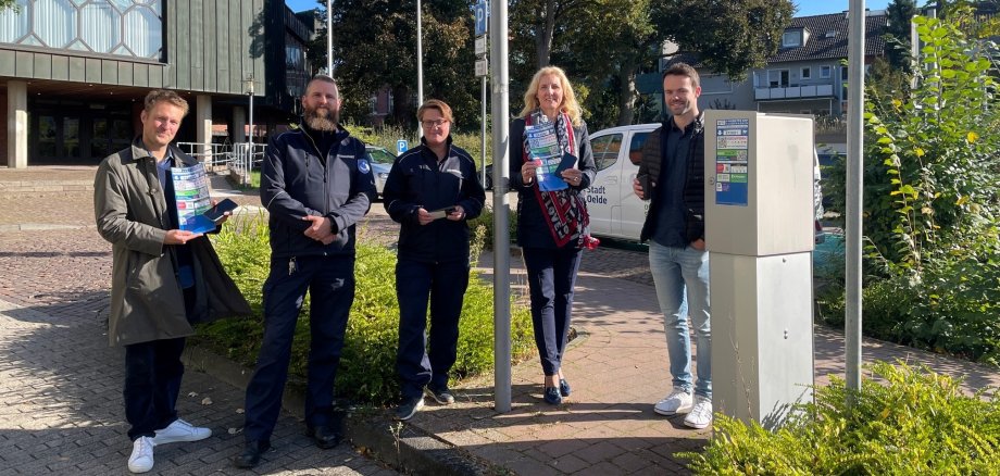 Philipp Zimmermann von "Smartparking", die Kollegen vom Außendienst des Ordnungsamtes Pasqual Steden und Tatjana Wirt-Kotecki, Bürgermeisterin Karin Rodeheger und Christian Griesedieck (Stadt Oelde) (v.l.) sind überzeugt von der bargeldlosen Zukunft des Parkens.