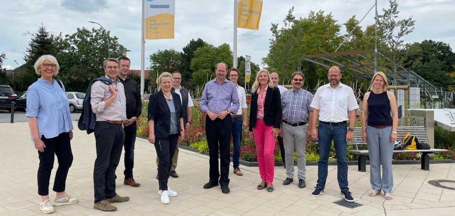 Gfw-Geschäftsführerin Petra Michalczak-Hülsmann, Kreisdirektor Dr. Stefan Funke, Volker Combrink, Ordnungsdezernentin Petra Schreier, Stadtbaurat André Leson, Landrat Dr. Olaf Gericke, Fachbereichsleiter Jakob Schmid, Bürgermeisterin Karin Rodeheger, Kai John, Erster Beigeordneter und Kämmerer Michael Jathe, Umweltdezernent Dr. Herbert Bleicher und Geschäftsführerin Forum Oelde Melanie Wiebusch (v.l.)