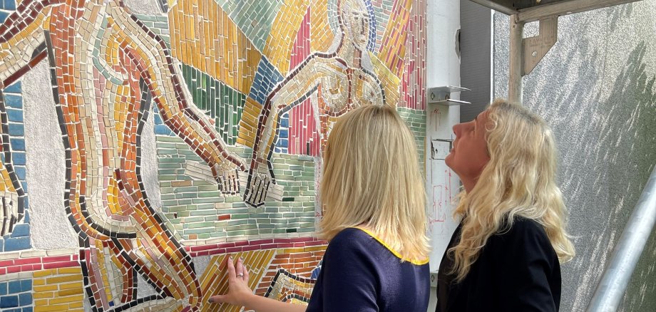 Melanie Wiebusch, Betriebsleiterin Forum Oelde und verantwortlich für Kunstwerke in Oelde (links) begutachtet gemeinsam mit Bürgermeisterin Karin Rodeheger das sieben Meter hohe Mosaik des Künstlers Herbert Benedikt am Umkleidegebäude des Jahnstadions.