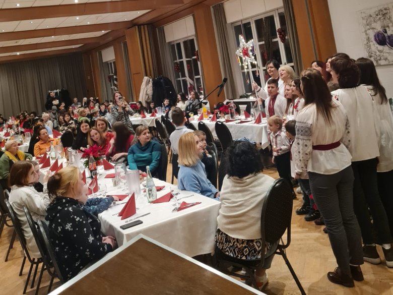 Weil eine gemeinschaftliche Weihnachtsfeier in den Wohnheimen schwierig zu realisieren ist, hat der Fachdienst Soziales der Stadt Oelde am 15. Dezember ein Weihnachtsessen für die geflüchteten Familien im Bürgerhaus organisiert. Jakob Schmid, Leiter des Fachbereichs 1 der Stadt, hat die Familien begrüßt und seine Worte wurden in mehrere Sprachen übersetzt. Es gab ein leckeres Büffet und für besondere Adventsstimmung sorgte eine Gruppe in Oelde lebender Ukrainer*innen, die in festlicher Tracht weihnachtliche Lieder sang. Ehrenamtliche und finanzielle Unterstützung leisteten der Ortsverband Oelde der AWO und die DRK Stiftung.