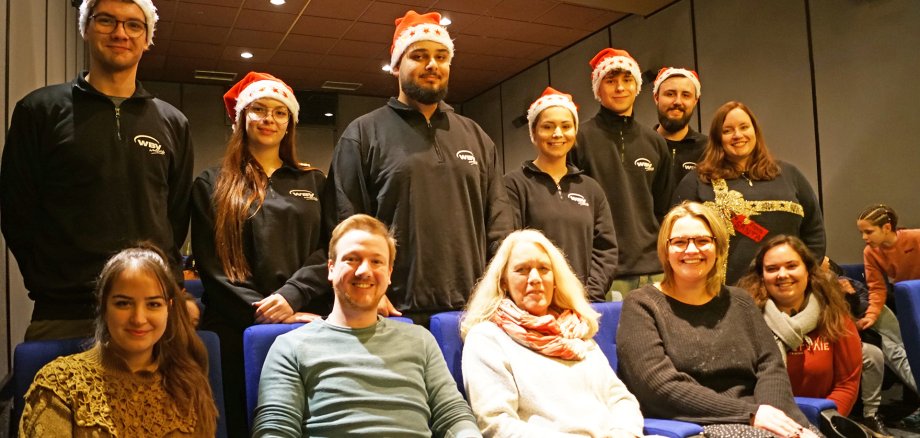 Tatkräftig unterstützt haben die Kinoaktion die Azubis der WBV in der oberen Reihe v.l.: Max Hombrink, Nadine Stiglbauer, Ibrahim Altun, Emely Heine, Anton Cujko, Oliver Böhnke und Tanja Woldach vom Mütterzentrum Beckum, die für den Fachdienst Soziales tätig ist. In der unteren Reihe zu sehen: Ezra Cetinkaya (Auszubildende Stadt Oelde), Jan Bräutigam (Leiter Fachdienst Soziales), Frau Hilker (WBV), Frau Eller und Frau Schulze Zumkley (beide Betreuerinnen im ehemaligen Kardinal-von-Galen-Heim vom Kolping).