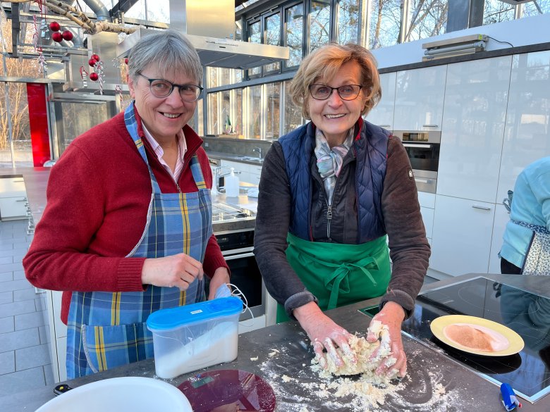 Margot Lehmköster und Ute Raestrup kneten Teig.