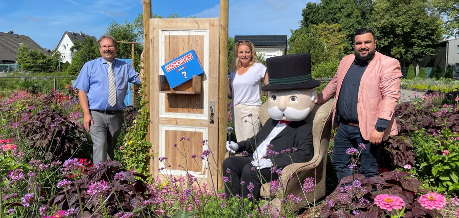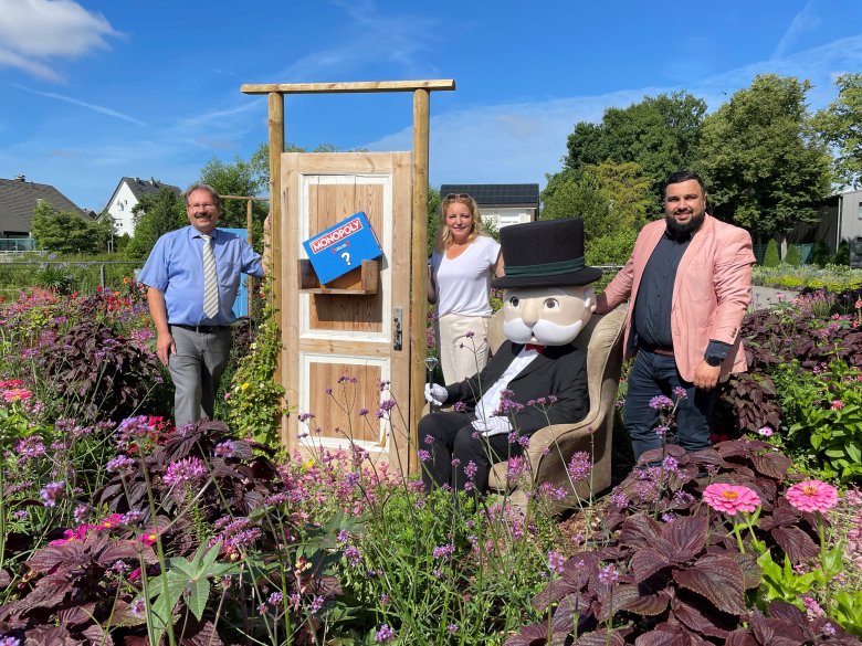 Mister Monopoly persönlich, Ali Pish Been von der apb Solutions GmbH und Heike Beckstedde, als Fachdienstleiterin auch für den Bereich Presse- und Öffentlichkeitsarbeit zuständig, stellten das Projekt gestern gemeinsam mit dem Ersten Beigeordneten Michael Jathe vor.
