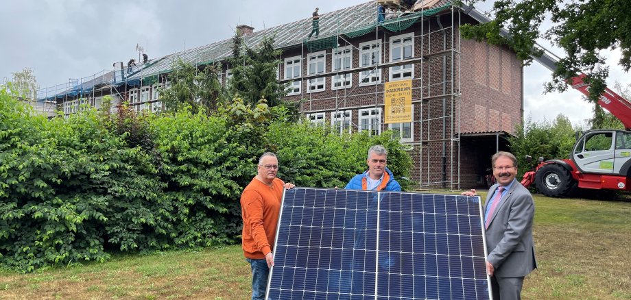 (auf dem Bild: Dirk Vogedes (Elektro Vogedes als bauausführendes Unternehmen), Thomas Eifler (Bauleiter der Stadt Oelde), Michael Jathe, Erster Beigeordneter und Schuldezernent)