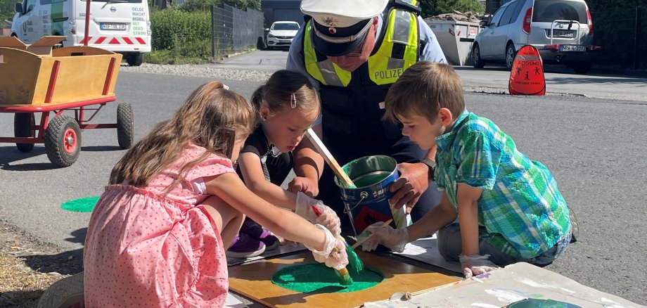 Gemeinsam mit Verkehrssicherheitsberater Richard Rauer von der Kreispolizeibehörde markierten die Kinder der Von-Ketteler-Schule ihren Schulweg.