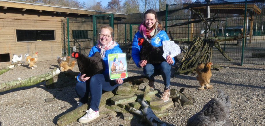 Bild zeigt (v. l.): Die Pädagogische Fachkraft Linda Gröne und Kursleiterin Alexandra Wiemann haben für die Rallye die Hühner auf der Erlebnisfarm besucht.