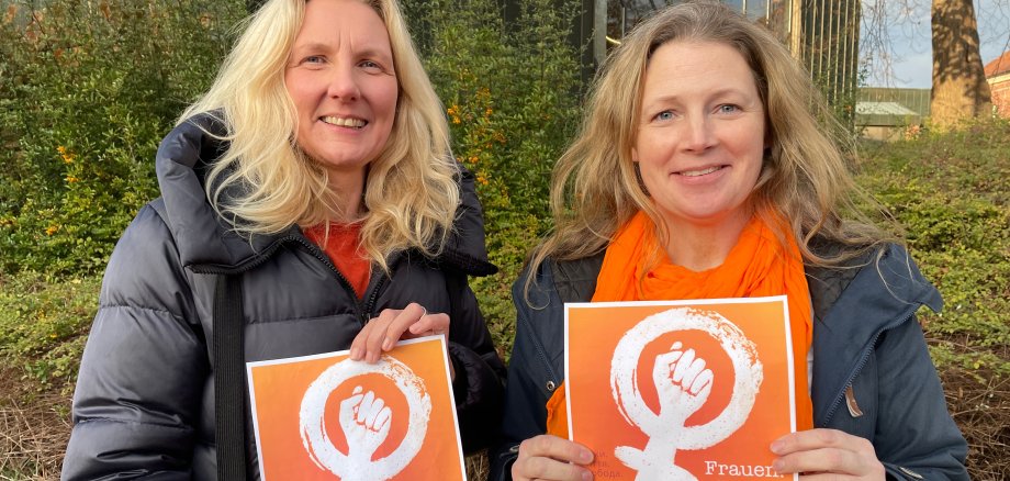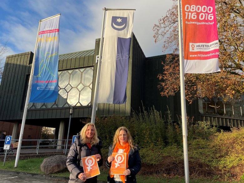 Anlässlich des Internationalen Tages gegen Gewalt gegen Frauen und Mädchen am 25. November wurden seitens der Stadt Oelde die Flaggen des Hilfetelefons für Frauen mit der Nummer 0800 166 016 und von Terre des Femmes mit der Aufschrift „frei leben ohne Gewalt“ gehisst. Die Stadt Oelde zeigt damit, dass sie sich gegen jede Form von Gewalt ausspricht. Insbesondere erklären sich Karin Rodeheger als Bürgermeisterin und Daniela Eggenstein als Gleichstellungsbeauftragte solidarisch mit den mutigen Frauen, die aktuell im Iran und Afghanistan für ihre Rechte auf ein freies und selbstbestimmtes Leben kämpfen. Derzeit leben in Oelde 53 Menschen afghanischer und 9 Menschen mit iranischer Staatsangehörigkeit.