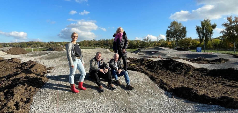 Nicola Köstens (Fachdienst Stadtentwicklung, Planung, Bauordnung), Albert Reen (Koordinator Baudezernat), Reinhold Becker (Leiter Baubetriebshof) und Bürgermeisterin Karin Rodeheger (v.l.) zeigten sich beim Ortstermin an der Baustelle des Pumptracks begeistert von dem Ergebnis, das innerhalb von zwei Wochen bereits erzielt wurde. Die Asphaltschicht für den Pumptrack soll bereits in der kommenden Woche aufgetragen werden.