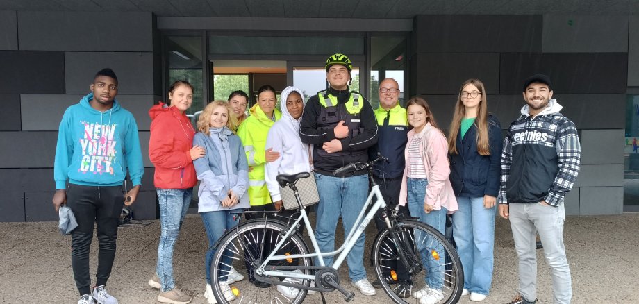 (Auf dem Bild v.l.n.r.: Lucky Godstime, Yuliia Kuznietsova, Nataliia Ponomarenko, Tamara Syniakova, PHKin Katharina Sikora, Blessing Osaru, Fares Latifeh, PHK Richard Rauer, Elina Kvak, Anelia Kvak, Shirzad Habibi)
