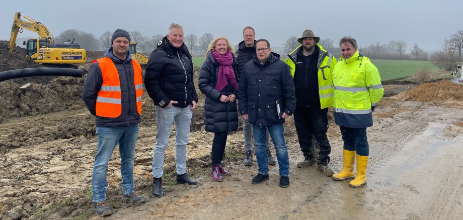 Vertreter*innen der Stadtverwaltung sowie der ausführenden Firmen Gnegel GmbH und Redeker Tiefbau GmbH machten sich in dieser Woche in Bild von dem Fortschritt der Bauarbeiten (im Hintergrund ist die neu entstehende Haupterschließungsstraße im Gewerbegebiet zu erkennen): Christoph Peveling (Gnegel GmbH, Bauleiter), Rodegang Elkendorf (Gnegel GmbH, Geschäftsführender Gesellschafter), Bürgermeisterin Karin Rodeheger, Markus Berheide vom Fachdienst Tiefbau und Umwelt, Stadtbaurat André Leson, Marcel Rehfeldt (Redeker Tiefbau GmbH, Polier) und Ernst Adams (Redeker Tiefbau GmbH, Bauleiter)