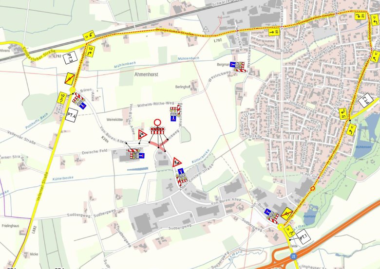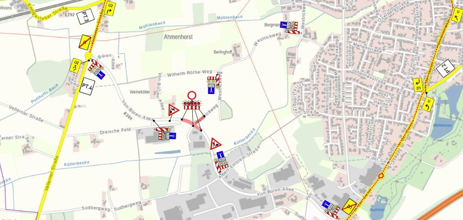 Im Gewerbegebiet Oelde A2 beginnen in der zweiten Februarwoche die Baumaßnahmen zur Erschließung der Erweiterungsfläche. Weil Versorgungsleitungen gelegt und die Verkehrsinfrastruktur geschaffen werden muss, wird die Von-Büren-Allee im Bereich um die Kreuzung Westrickweg vom 6. Februar an für eine Dauer von voraussichtlich zwei Monaten voll gesperrt. In dem Bereich wird die Fahrbahn verbreitert, sodass zwei Abbiegespuren hergestellt werden können. Die Zufahrt zur Albert-Einstein-Straße über die Von-Büren-Allee ist nicht betroffen ebenso nicht die aus nördlicher Richtung zum Dreische Feld. Umleitungen werden über In der Geist, Paulsburg und Ennigerloher Straße sowie über die Vellerner Straße eingerichtet. Die Zufahrten zu den Firmen mit den Adressen Von-Büren-Allee 41 und 43 bilden eine Ausnahme und werden im vollgesperrten Bereich gewährleistet.