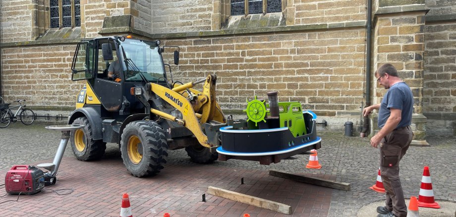 Martin Bußmeier (im Radlader) und Reinhold Ostkamp vom Baubetriebshof der Stadt Oelde montieren das Schiff, eines von vier neuen Spielgeräten in der Innenstadt