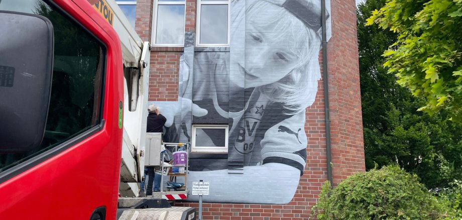 Als ob er mit dem davor parkenden Auto spiele, wirkt das 12 Meter hohe Motiv des Jungen, welches am DRK-Haus auf der Poststraße angebracht wurde.