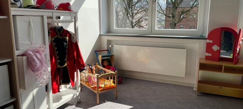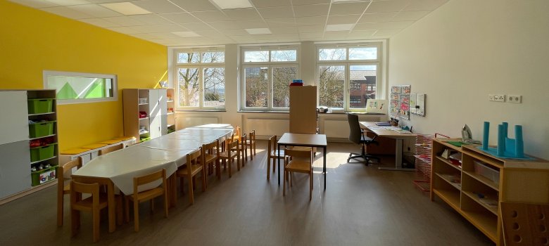 Im gelben Raum kann gebastelt, gemalt oder anderweitig kreativ gearbeitet werden. Auch der Schreibtisch der Mitarbeiterinnen ist hier. Wer im grünen Raum gerade ein Spiel spielt oder ein Puzzle macht, lässt sich mit einem Blick durch das Fenster links herausfinden.