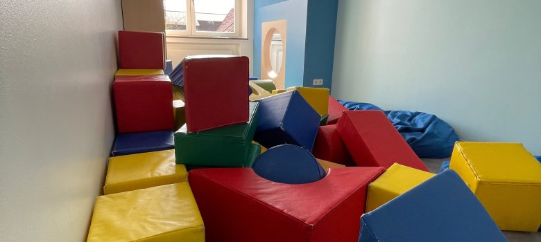 Der Toberaum wurde bereits gut genutzt. Durch das Loch in der Wand können die Kinder in einen anderen Raum krabbeln.