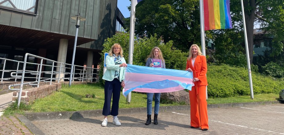 Ashley Volbracht (Initiatorin der Gruppe T*OM), Daniela Eggenstein (Gleichstellungsbeauftragte der Stadt Oelde) und Bürgermeisterin Karin Rodeheger stehen auf dem Rathausvorplatz unter der gehissten Regenbogenflagge und halten die Trans*-Fahne zwischen sich.