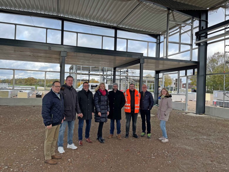 (v.l.n.r.: André Leson (Stadtbaurat), Hannah Baumhus (Bauunternehmen Baumhus), Johanna Reckmann-Tigges und Matthias Reckmann (MR Maschinenbau Reckmann ), Bürgermeisterin Karin Rodeheger, Ralf Schestak (UZS DekanterService), Volker Combrink (städt. Wirtschaftsförderer), Christian Steinhoff (UZS DekanterService) und Thomas Keßler (Bauunternehmen Baumhus)