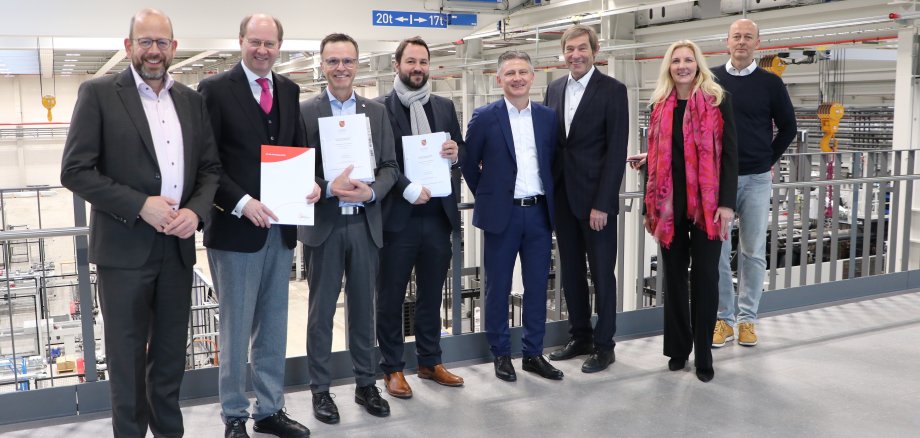 Baudezernent Dr. Herbert Bleicher, Landrat Dr. Olaf Gericke, die Craemer Geschäftsführer Siegbert Geldner, geschäftsführender Gesellschafter Christoph J. Brandenburg und Geschäftsführer Stephan Kogel, Günter Kozlowski (Geschäftsführer Aurea Gewerbepark), Bürgermeisterin Karin Rodeheger und Ralf Westermann (Craemer) freuen sich, dass das firmeneigene Windrad nun gebaut werden kann. – (Foto: Kreis Warendorf).