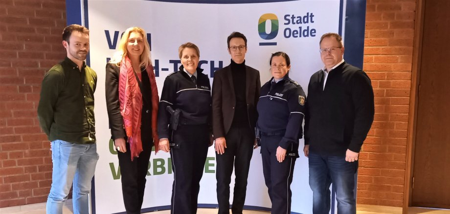 Ein starkes Team für Oeldes Sicherheit und Ordnung: Christian Griesedieck (stellv. Leiter Fachdienst Ordnungswesen), Bürgermeisterin Karin Rodeheger, Dienststellenleiterin Hauptkommissarin Dagmar Artmeier, Jakob Schmid (Leiter Fachbereich 1), Katrin Lange (stellv. Dienststellenleiterin) und Stefan Boegel (Fachdienstleiter Ordnungswesen)