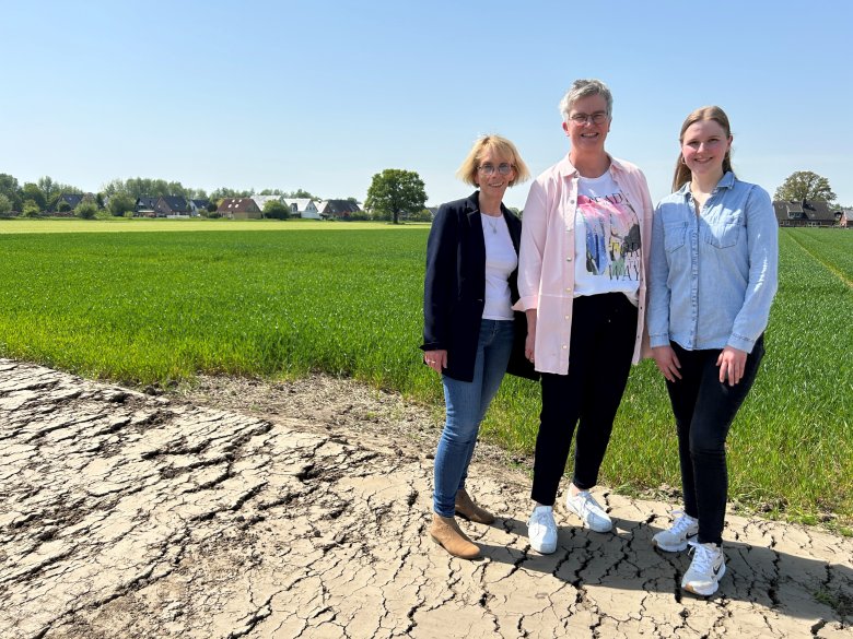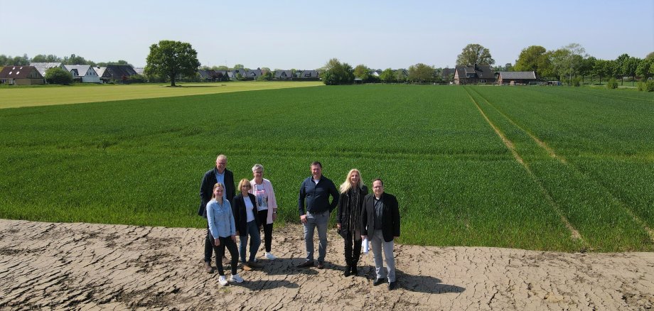 Das Team für das Wohnbaugebiet Weitkamp II beim Pressetermin zum Start der Vermarktung: Nastja Liedtke, Maria Klose und Stefanie Bathe-Funke (1. Reihe v. l.) aus dem Fachdienst Liegenschaften kümmern sich vorrangig um die Bewerber*innen für die Wohnbaugrundstücke. Hinter Ihnen in der zweiten Reihe steht Rolf Berlemann von den Stadtwerken Ostmünsterland, durch deren innovatives Nahwärmenetz das Baugebiet mit Wärme versorgt wird. Auch Wirtschaftsförderer und Fachdienstleiter Liegenschaften Volker Combrink, Bürgermeisterin Karin Rodeheger und Stadtbaurat André Leson, dessen Fachdienst Tiefbau die Erschließung koordiniert, freuen sich, dass hier bald viel Wohnfläche für alle Generationen entsteht.