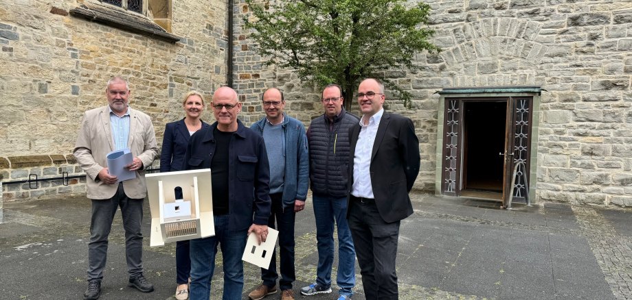 (auf dem Bild v.l.n.r.: Albert Reen (Stadt Oelde), Bürgermeisterin Karin Rodeheger, Architekt Thomas Becker, Johannes Klein, Verwaltungsreferent Michael Vennewald, Pfarrer André Pollmann)