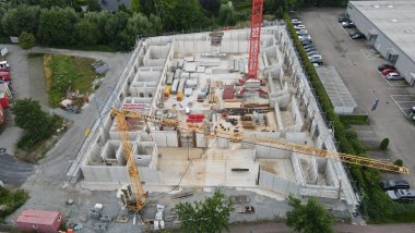 Auf der Baustelle für die neue Multifunktionshalle in Oelde geht es zügig voran. In den letzten Wochen wurden die Wände des Erdgeschosses errichtet. Die Grundstruktur mit dem Foyer, der Tribüne und dem Grundriss der großen Halle ist nun bereits gut erkennbar.