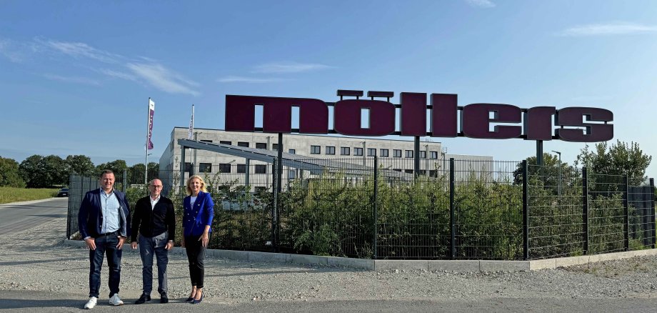 (auf dem Bild: Volker Combrink, Wirtschaftsförderer der Stadt Oelde, Thomas Vertgewall, CEO Möllers Packaging Technology, Bürgermeisterin Karin Rodeheger)