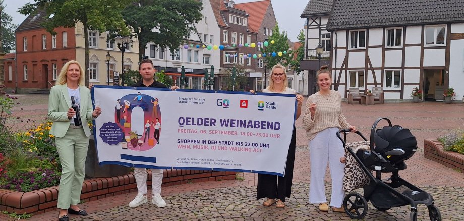 Werben für den Oelder Weinabend (v.l.) Bürgermeisterin Karin Rodeheger, Leonard Gromes (Wirtschaftsförderung ), Annika Marx (Forum Oelde), Carla van Staa (Gewerbeverein) mit Anouk.