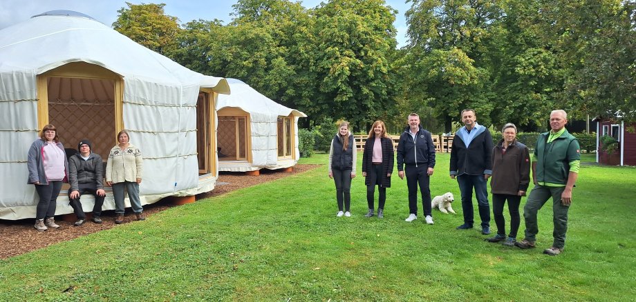 Präsentieren die beiden Jurten für die Waldkita: (v.L.) Lara Menzel, Steffen Schrulle und Dorit Kreker (Erzieherteam), Lina Hein, (DRK) Ann-Christin Heitmann (Jugendamt), Detlef Weißenborn (DRK), Hendrik van der Veen (Jugendamt) sowie Lydia und Alex Altenau.