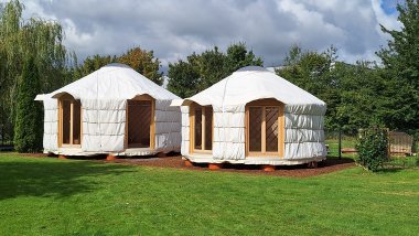 Die Idee für die beiden mongolischen Nomadenzelte, die künftig Schutz vor schlechtem Wetter bieten, kam von Hendrik van der Veen, dem Jugendamtsleiter der Stadt Oelde. Die Jurten mit einem Durchmesser von 5 und 6 Metern sind nicht nur ein architektonisches Highlight, sondern auch Symbol für Naturverbundenheit. Ohne einen einzigen Nagel errichtet, folgen sie der Tradition der Nomaden in Zentralasien.