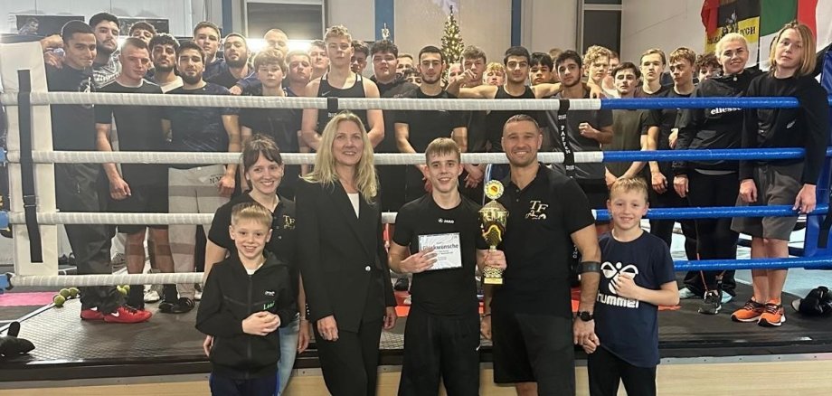 Stehen vor dem Boxring: Louis und Nikola Falkenhagen, Bürgermeisterin Karin Rodeheger, Marlon Krause, Oleg Eirich und Elias Falkenhagen