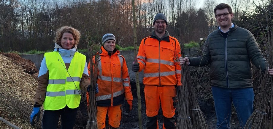 Auf dem Bild (v.l.n.r.): Klimaschutzmanagerin Stefanie Gröne, Martin Bußmeier und André Schürmann vom Baubetriebshof der Stadt Oelde sowie Daniel Stoffers, der eine Ligusterhecke abholt.