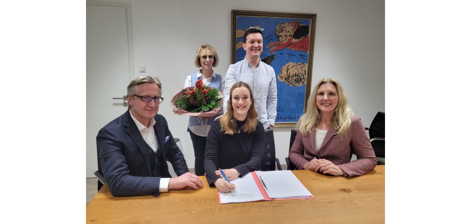 Jörg Wecek (Notar), Maria Klose (Fachdienst Liegenschaften), Dr. Kerstin Schultenkämper, Sergej Schultenkämper, Bürgermeisterin Karin Rodeheger