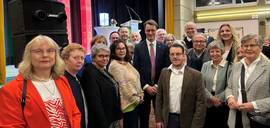 Das Gruppenfoto zeigt die engagierten Ehrenamtlichen aus Oelde und den Ortsteilen gemeinsam mit Ministerpräsident Hendrik Wüst, dem Oelder Landtagsabgeordneten Daniel Hagemeier und Bürgermeisterin Karin Rodeheger.