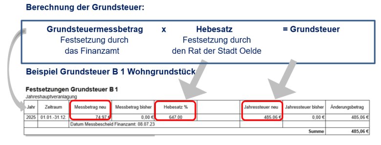 Die Stadt Oelde erhebt die Grundsteuer auf Basis der durch das Finanzamt zum 01.01.2025 für jedes Grundstück neu festgesetzten Grundsteuermessbeträge und berechnet die Grundsteuer 2025 somit auf Grundlage der neuen gesetzlichen Regelungen.