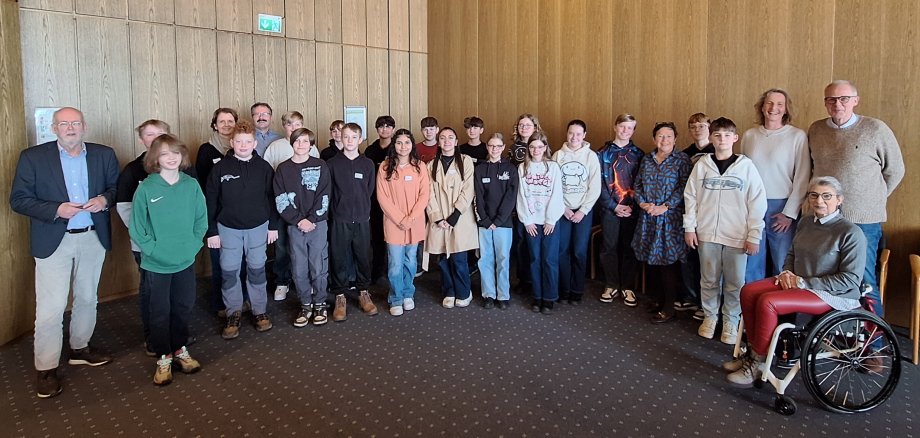 Das Foto zeigt die teilnehmenden Schüler*innen der Jahrgangsstufen 5 bis 7 gemeinsam mit der die Projektgruppe begleitenden Lehrerin Marion Harbaum, dem Stadtkämmerer und Ersten Beigeordneten Michael Jathe sowie den stellvertretenden Bürgermeisterinnen Andrea Geiger und Barbara Köß. Ebenfalls anwesend waren von Seiten der Fraktionen Christoffer Siebert, Kerstin Horstmann und Wolf-Rüdiger Soldat.