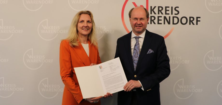 Die Freigabe des Oelder Haushaltes für das Jahr 2025 überreichte Landrat Dr. Olaf Gericke am gestrigen Donnerstag an Bürgermeisterin Karin Rodeheger. Landrat und Bürgermeisterin hoben bei der Übergabe der Haushaltverfügung die schnelle und gute Zusammenarbeit der Verwaltungen hervor. Mit der Freigabe können die geplanten Maßnahmen der Stadt Oelde nun umgesetzt werden.