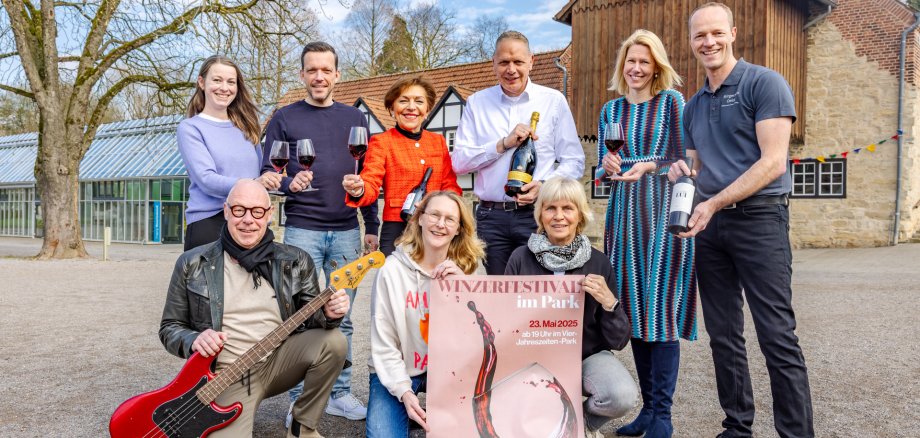 Bild: Die Beteiligten am Winzerfest im Park am Freitag, 23. Mai, freuen sich auf das Ereignis. Das Bild zeigt (v. l.) Caro Friemel und Theo Druffel (Sängerin und Bassist der Band Millrock), Michael Kaupmann (Förderverein), Sommelière Luitgard Fröhlig, Katja Elbracht (Förderverein), Ulrich Lier (Volksbank), Dorothee Linnenbrink-Stehmann (Förderverein), Melanie Wiebusch (Forum Oelde) und Christian Pohlmann (Bürgerhaus).